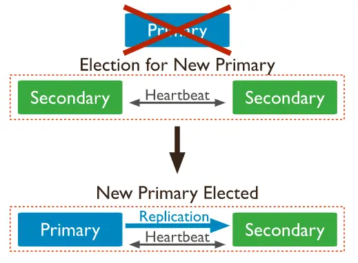 副本集的每个节点之间会维持着两秒一次的心跳检测,当从节点与主节点的通信时间超过配置的 electionTimeoutMillis 时间 (默认为10秒) 时,则认为该主节点出现故障,此时副本集会进行新的主节点选举。