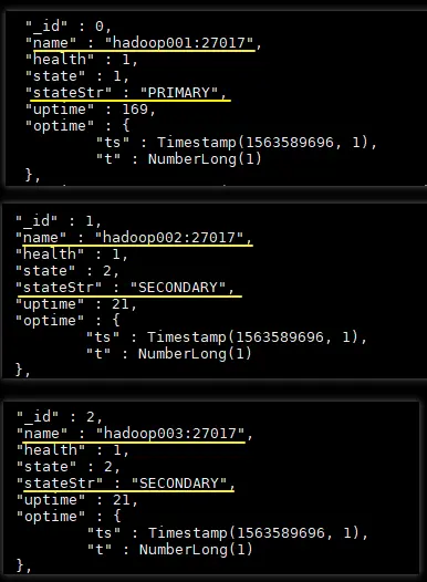 使用 rs.status() 命令查看副本集状态,部分输出如下。从输出中可以看到 hadoop001 为 PRIMARY 节点,而 hadoop002 和 hadoop003 均为 SECONDARY 节点,此时代表副本集已经搭建成功。
