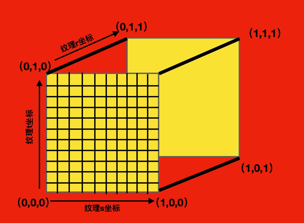 纹理坐标(参照上图的s,t,r纹理坐标系那张图,如果不理解需要细细体会)