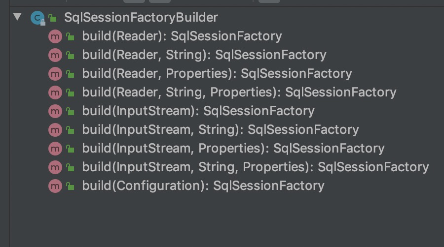 首先我们看一下SqlSessionFactoryBuilder类内部的结构,原来SqlSessionFactoryBuilder多次重载build方法利用建造者模式来创建我们最终的DefaultSqlSessionFactory对象。