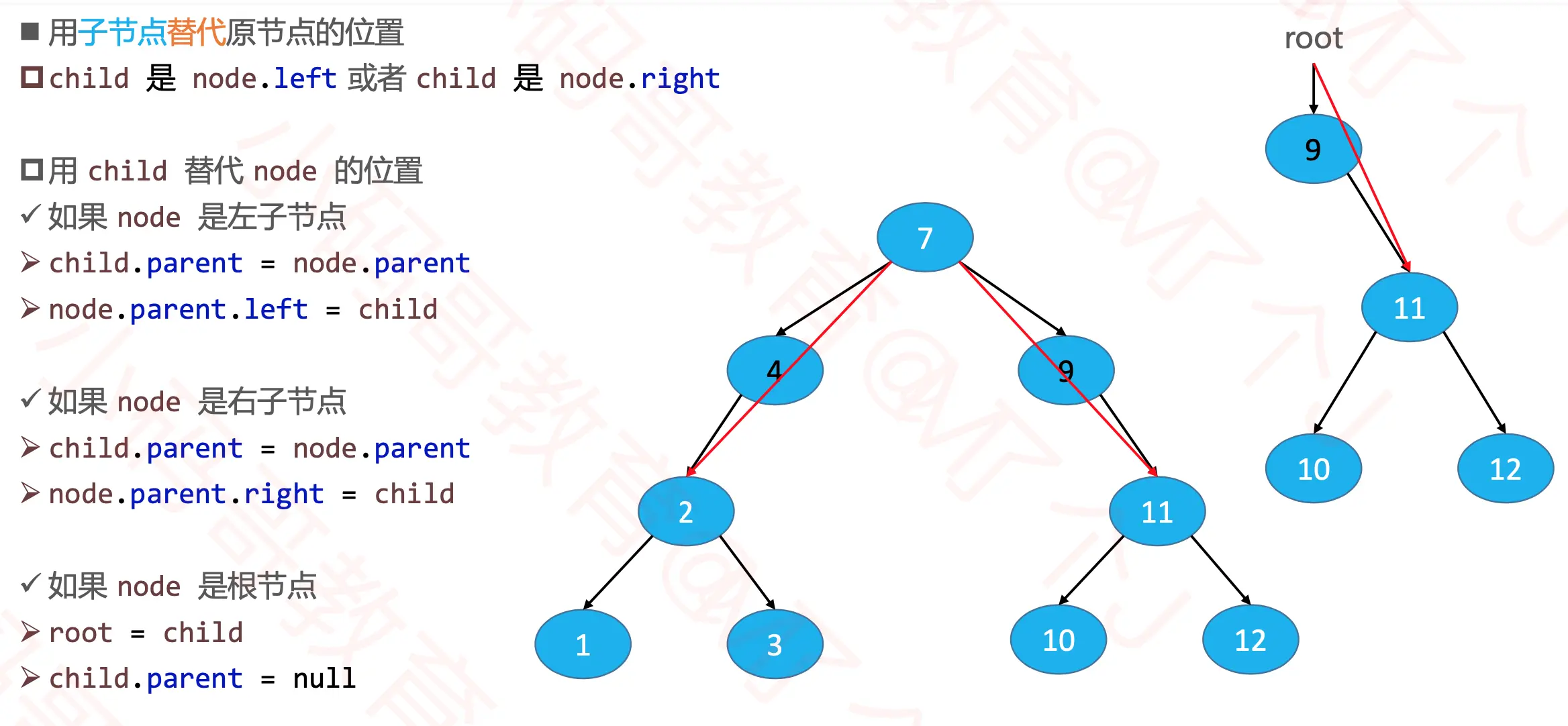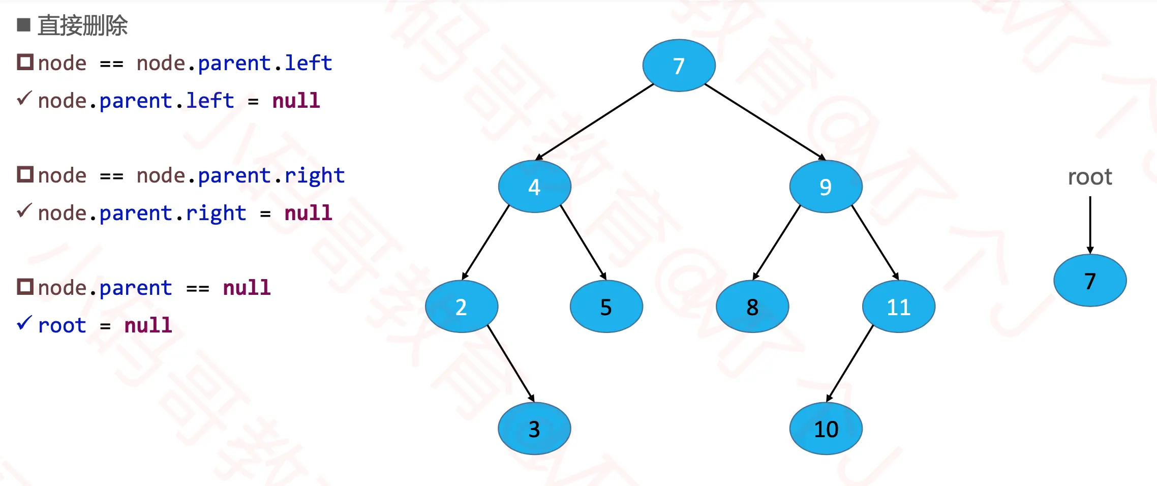 - 所以删除叶子节点时, 在判断是那种节点后, 直接删除即可