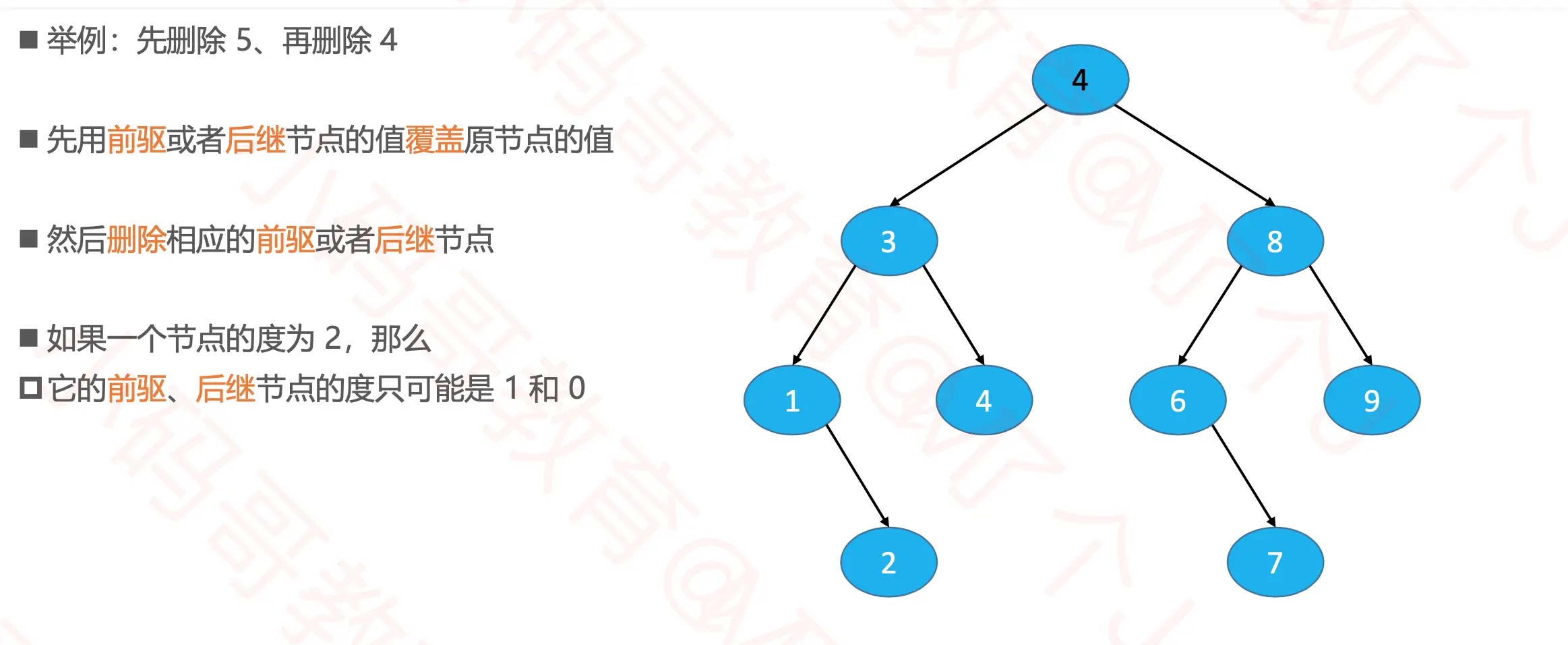 前驱或者后继节点的度只可能是1和0, 所以也就是删除度为1的节点或者删除叶子节点