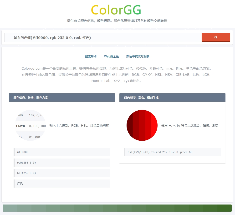 Colorgg颜色代码百科全书,提供颜色信息,颜色搭配,颜色代码查询以及RGB、CMYK、HSL、HSV、XYZ、xyY、CIELAB、LUV、LCH等颜色空间转换。。