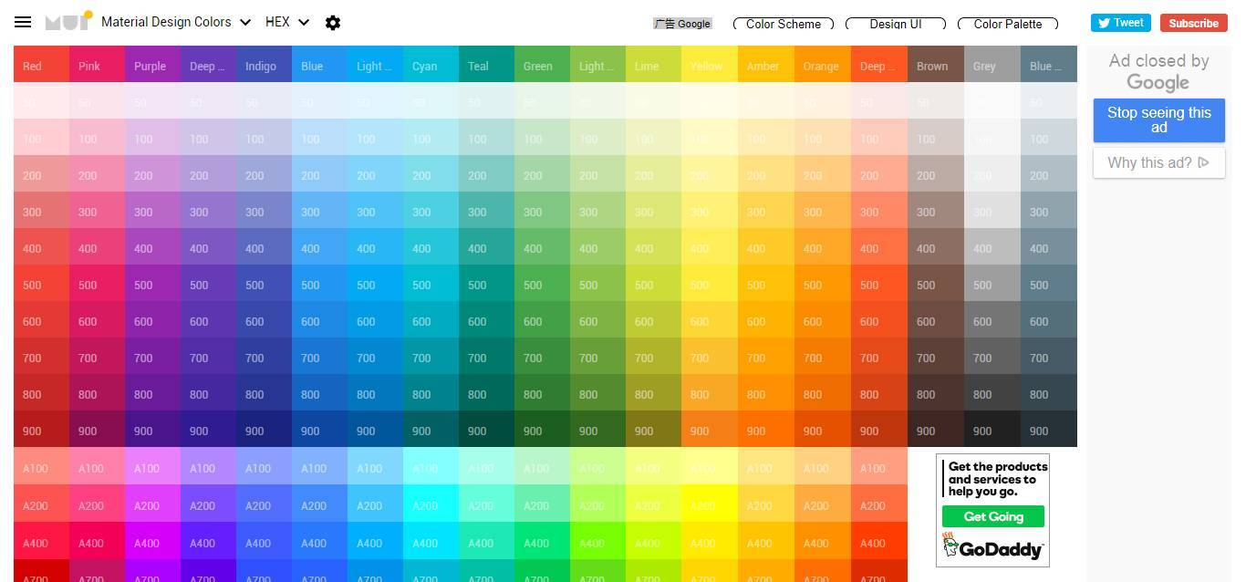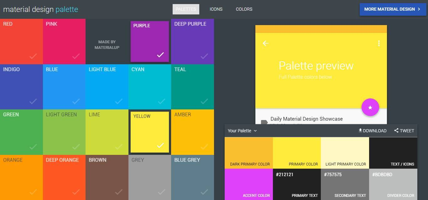 Material Palette是一款提供Material Design配色的线上工具,它的用法很简单,你只要找出想要搭配的两种颜色,它就会显示出两种颜色搭配在一起的效果预览,并提供你较深或较浅的颜色选项,以及其他你可能会用到的颜色代码。