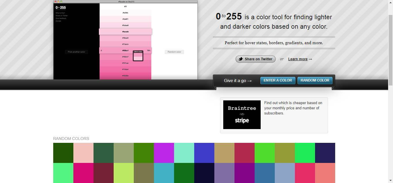 首先你可以通过0To255网站选择一个作为出发点的颜色(起始颜色),然后你会看到一个基于起始颜色、有序呈现色彩变化的颜色列表,这些颜色从上至下体现黑白(或者浓淡)的变化,你可以选择自己最满意的颜色,并且可以直接复制代码到自己的网页设计页面,或者直接查看其颜色符号再使用。