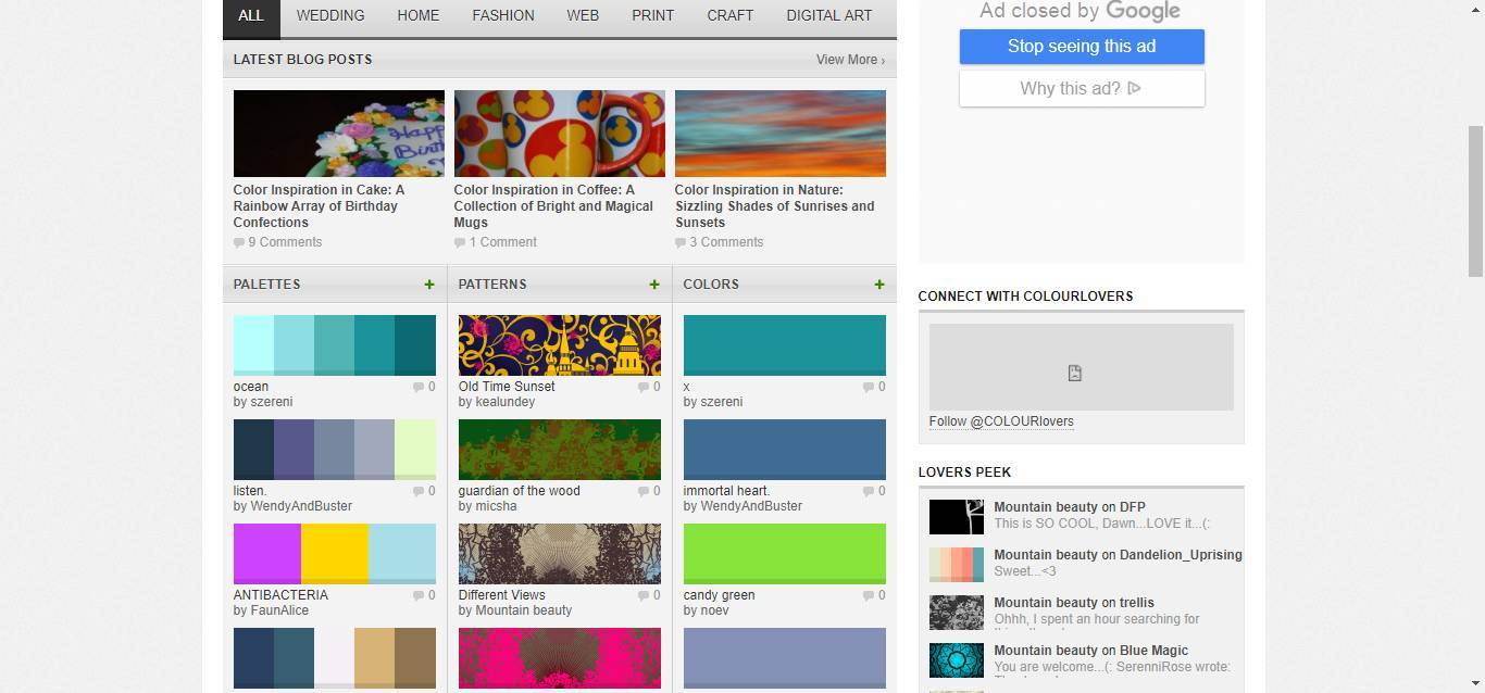 Colour Lovers是一个可以创建、分享、讨论配色方案的讨论网站,有提供色彩搜索的功能,输入你想要的色彩形容词,就会显示出有关这个形容词的色盘供你选择。在Browse中还有颜色、印象选项可以让你勾选,查询之后会传回色块排列,帮你将色系有序的做整理。