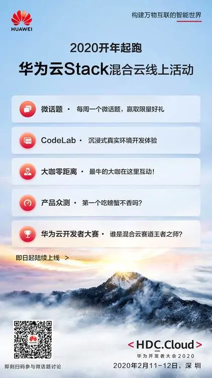 在华为开发者大会2020(Cloud)召开前夕,华为云Stack混合云开发者社区为大家提前准备了一系列精彩的活动,帮助开发者们快速了解混合云技术,体验混合云开发: