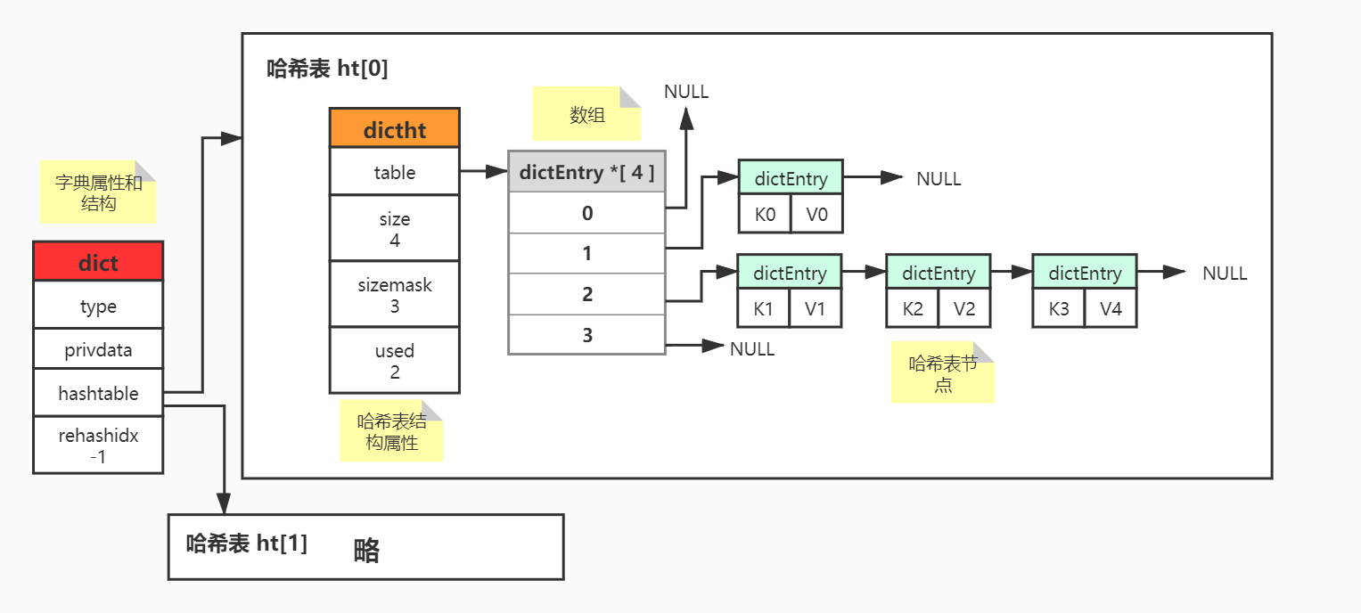 - ht属性:是一个包含两个项的数组,这两个项都是一个dictht的哈希表,一般情况下,字典只是有ht[0]哈希表,ht[1]哈希表只会对ht[0]哈希表进行rehash时使用。