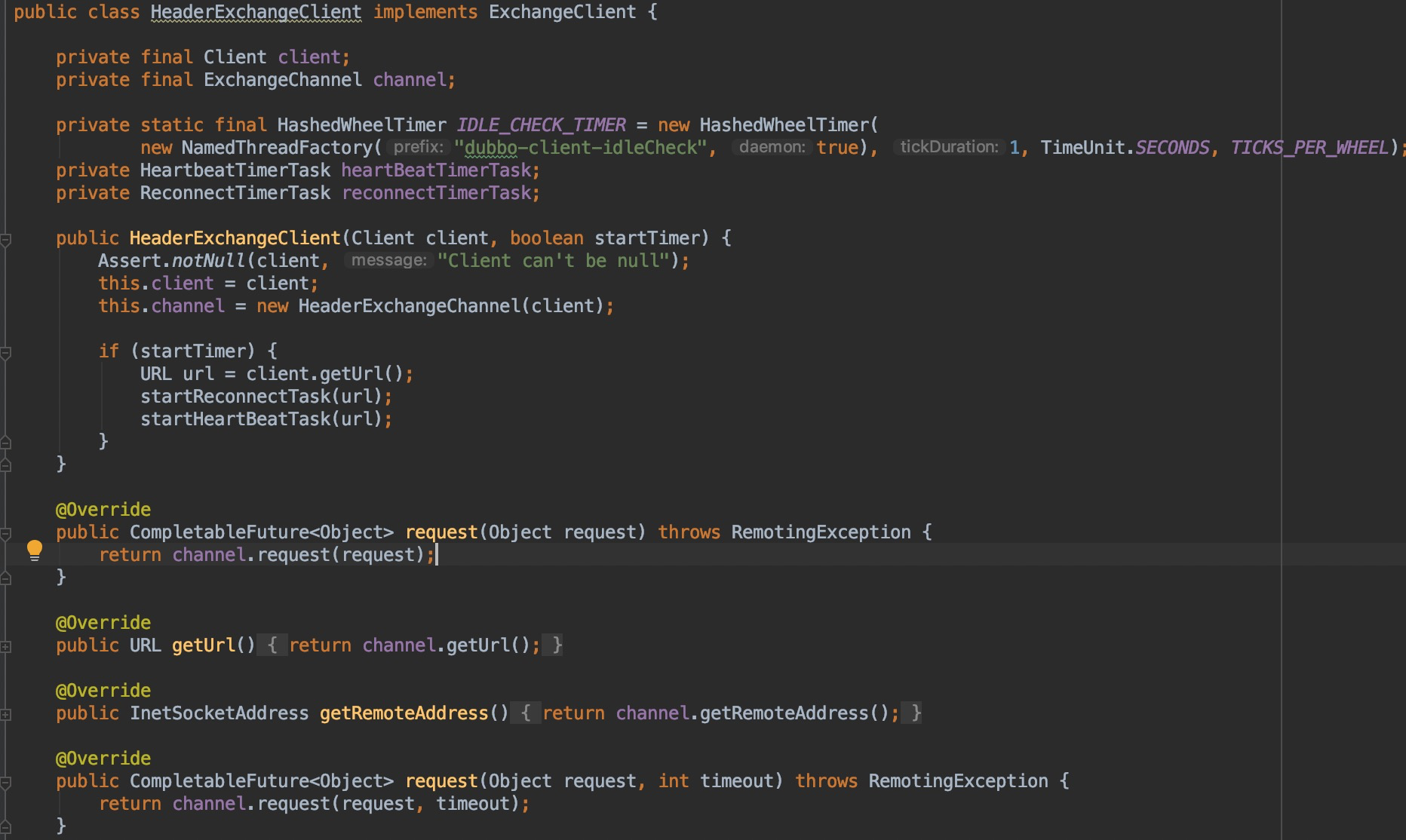 在实现中这个调用被传递到HeaderExchangeClient维护的HeaderExchangeChannel对象,而channel后续的具体操作又依赖构造函数中传入的Client,这个参数实际是一个Channel接口,我们看一下HeaderExchangeClient的构造函数: