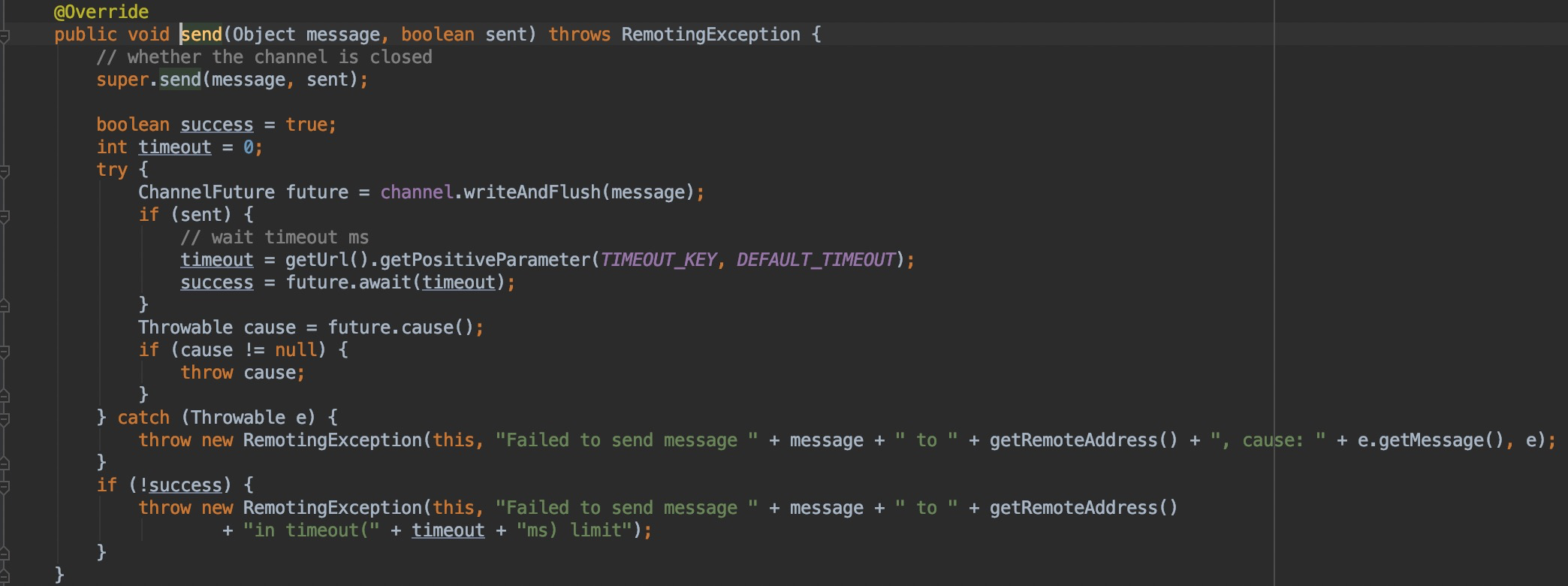 执行Netty的channel.write()将数据真正发送出去,也可以由此看出boolean sent参数的含义:是否去等待发送完成、是否执行超时的判断。