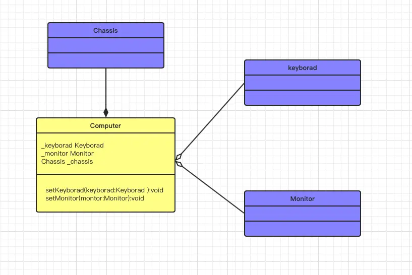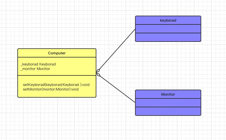 特性: 同样只描述成员属性、并且整体和部分是可以分开的,通常表现为那些通过 set 方法传递数值的成员变量,需要注意的是聚合关系是关联关系的特例
