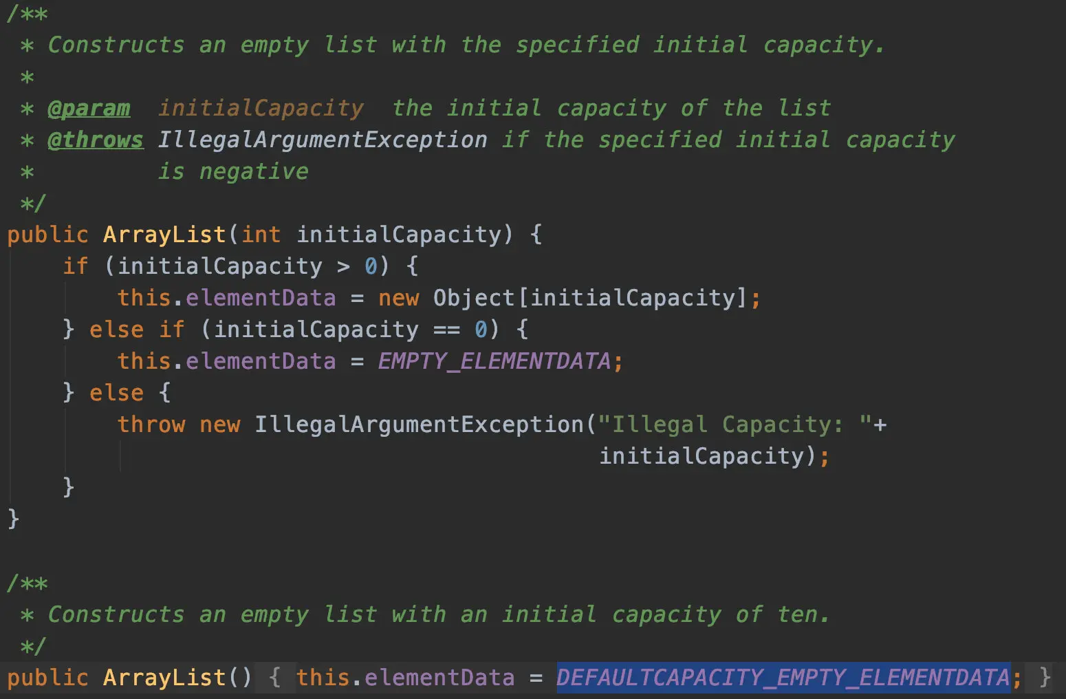 然后你们也可以看到,他的构造方法,如果你传入了初始值大小,那就使用你传入的参数,如果没,那就使用默认的,一切都是有迹可循的。