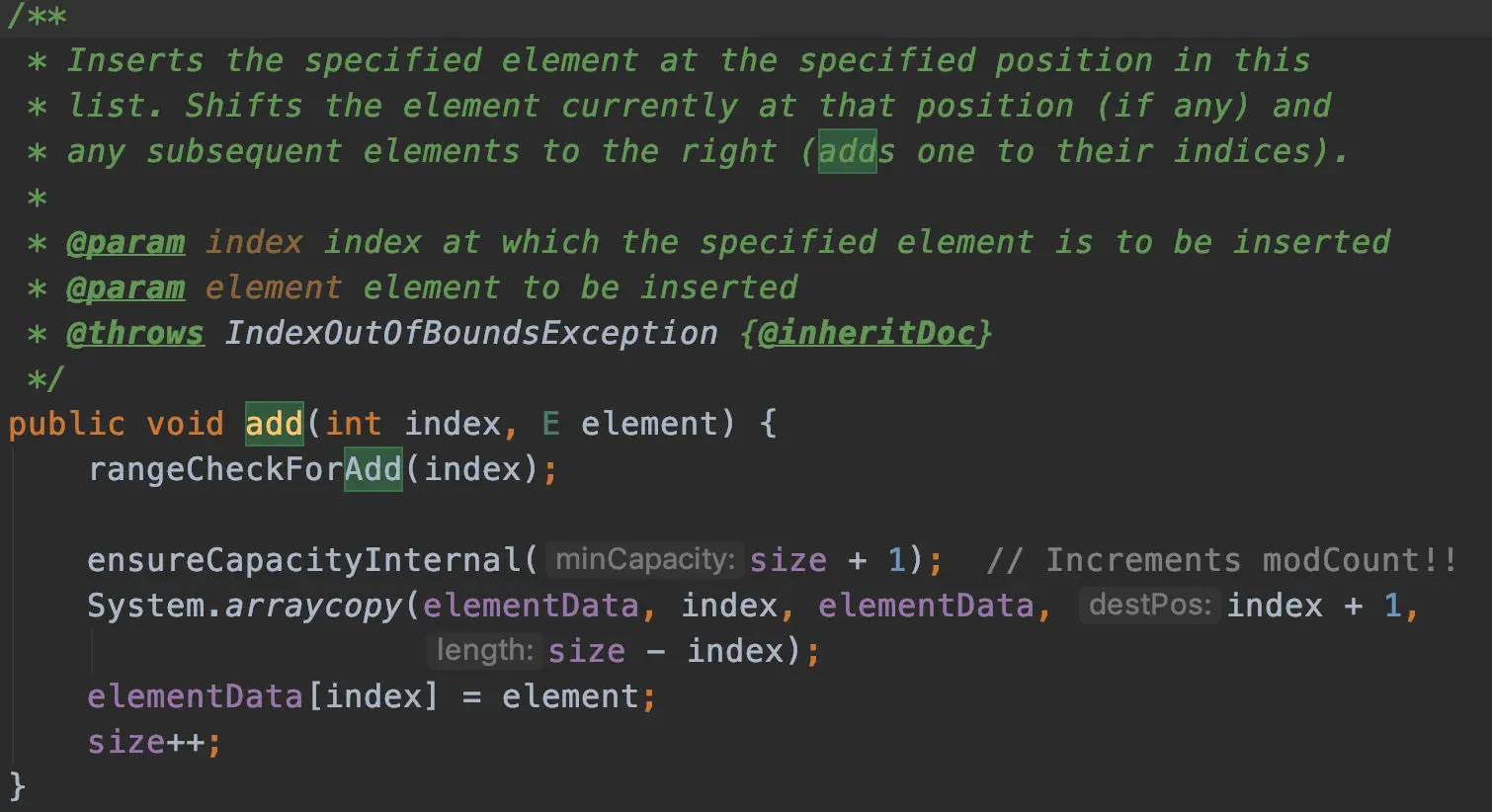 指定位置新增的时候,在校验之后的操作很简单,就是数组的copy,大家可以看下代码。