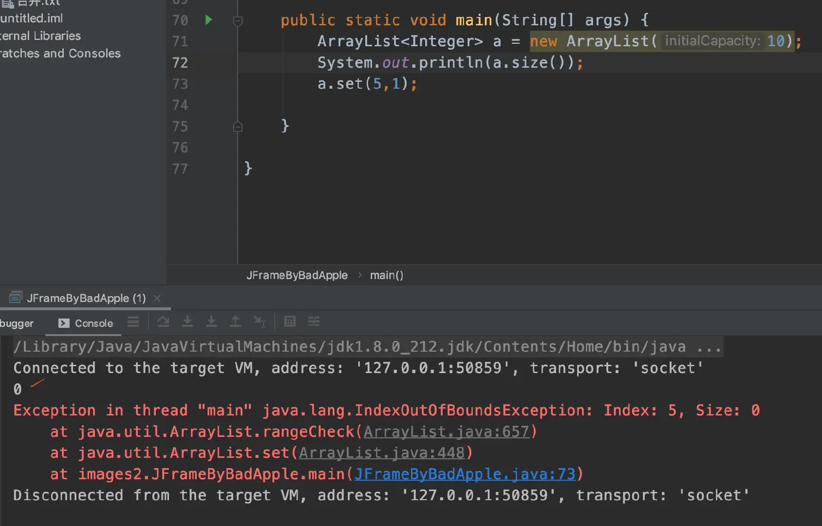 大家可能有点懵,我直接操作一下代码,大家会发现我们虽然对ArrayList设置了初始大小,但是我们打印List大小的时候还是0,我们操作下标set值的时候也会报错,数组下标越界。