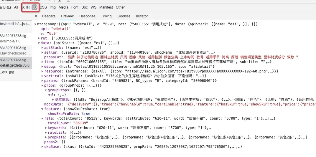 打开Chrome Network面板, 让我们来看taobao是怎么加载这个页面数据的. 根据经验, 一般是异步加载的, 要么是XHR,要么就是js(jsonp), 你应该很快可以找到