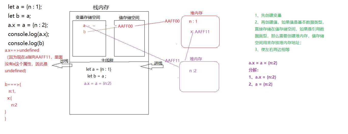 JS中堆栈内存的练习 _米花 2020-01-08 159 阅读1分钟 题目: let a = {n : 1}; let b = a; a.x = a = {n : 2}; console.log(a.x); console.log(b) 解析
