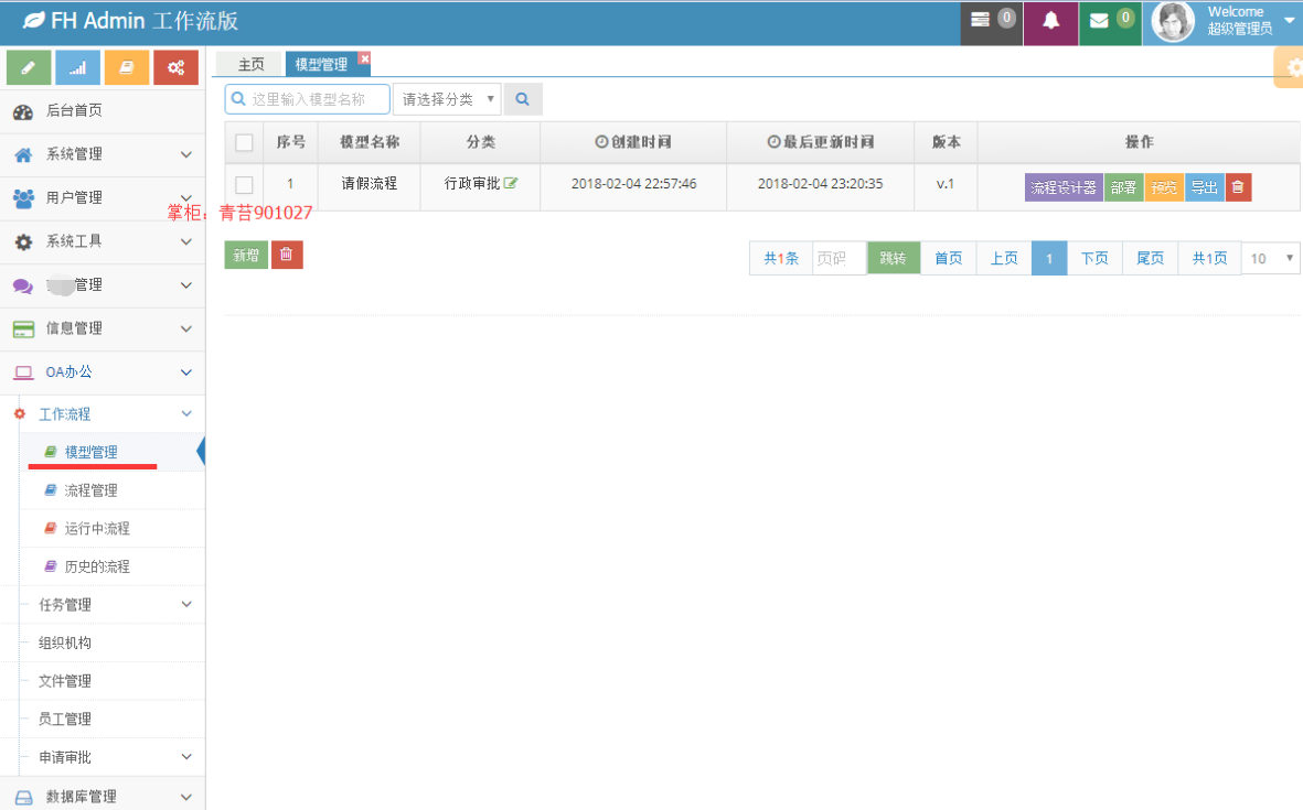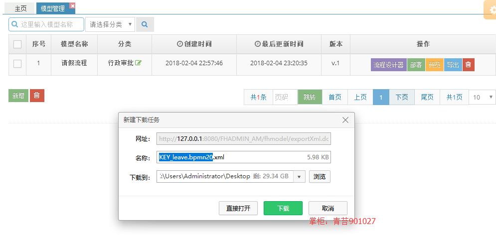 1.模型管理 :web在线流程设计器、预览流程xml、导出xml、部署流程