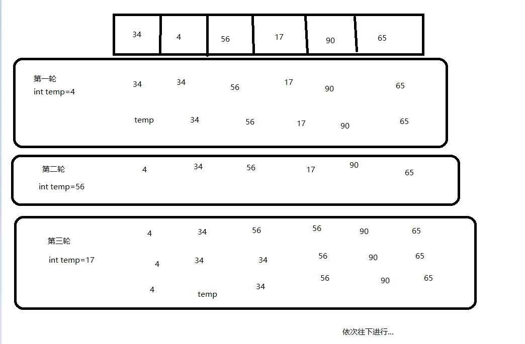 从下标1 开始 把下标1当做操作数,把操作数用一个临时变量存起来,然后和前一个比较,如果第0个数大于操作数,那么整个数列往后移,怎么个移法呢,就是操作数的下标位置等于 第0个数 4变成34,第一轮就算结束了,然后看发生变化的变量是操作数自己吗不是就吧操作数赋给它