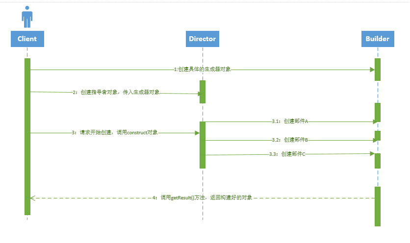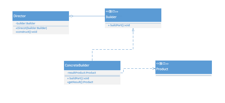 Director: 指导者,主要用来使用Builder接口,以一个统一的过程来构建所需要的Product对象。