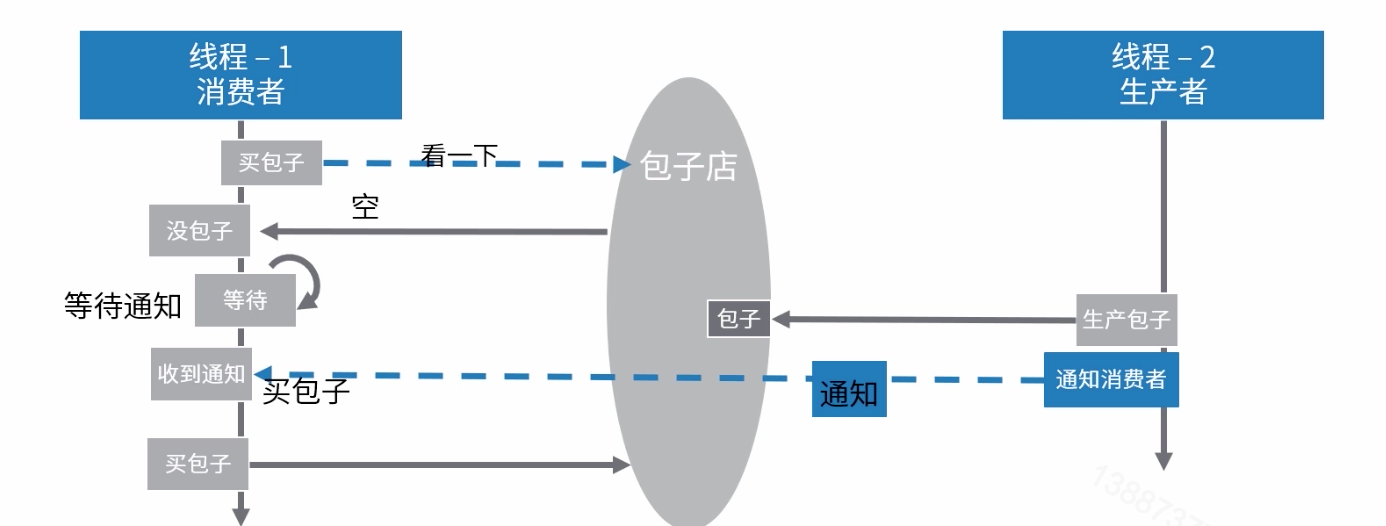 - 示例:线程1去买包子,没有包子,则不在执行。线程2生产包子,通知线程1继续执行。