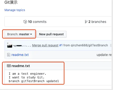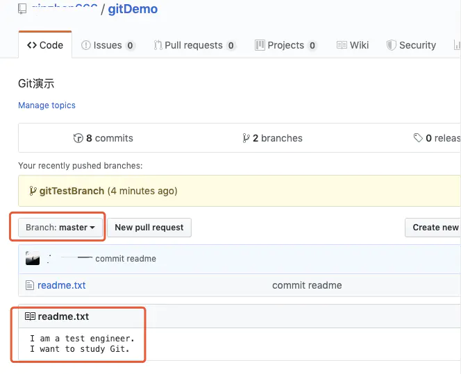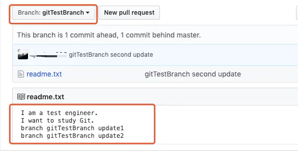 在GitHub上查看master分支和gitTestBranch分支的对比,可见gitTestBranch已成功push: