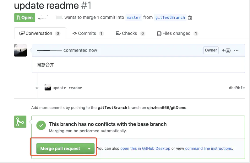 1.5)这个时候我们可以通过pr对分支进行merge:
