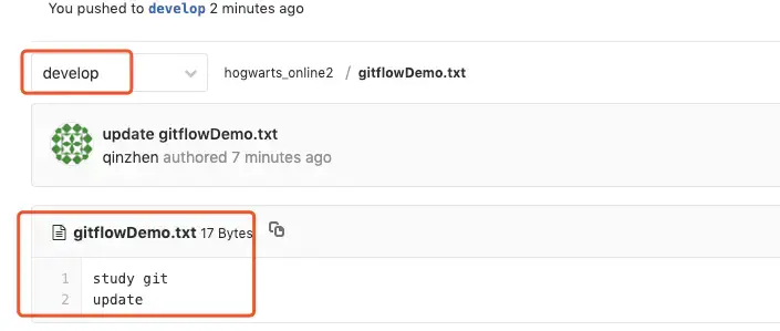 切换到本地develop分支,pull最新代码,merge本地gitflowDemo分支代码,push进远程develop分支