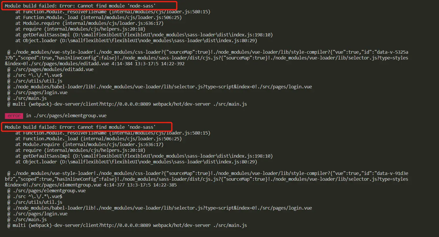 项目运行报错不能找到node-sass模块,如图:只要引用sass的文件都会报错