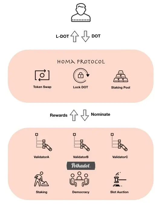 用户可以把持有的 DOT 锁定到 Acala Network 系统,获得锁定 Dot 的凭证 —— L-DOT。锁定的 DOT 进入到 Staking Pool,通过 Staking Pool 进行提名验证人,被提名的验证人参与 Polkadot的 Staking。当用户拥有资金需求时,可以把 L-DOT 作为抵押物存入 L-DOT 抵押池,生成抵押债仓(CDP),获得一定比例的稳定币 aUSD (Acala 网络中的稳定币),用户使用 aUSD 参与 Polkadot 跨链生态优质项目的众筹,金融产品(如存币生息),用作日常消费支出,去中心化交易所交易以及加杠杆等获取利润。当用户想要关闭 CDP 时,需要偿还所借的 aUSD 债务以及这笔债务所产生的稳定费与服务费用才能关闭 CDP 并拿回自己抵押物。