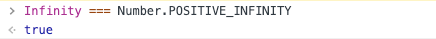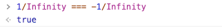 而 Infinity 比较特殊的一点在于,在 JavaScript 中 1 / Infinity 与 -1 / Infinity。 被认为是相等的(由于 +0 和 -0,下一节会进一步介绍)