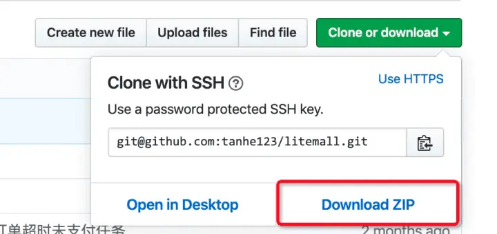 git clone git@github.com:tanhe123/litemall.git如果没有安装 Git,也可以直接在页面点击 Downlaoad Zip 直接下载代码并解压: