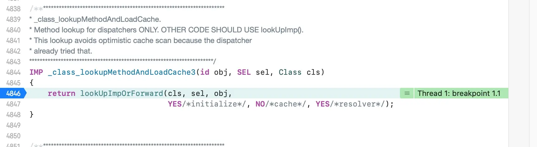 IMP imp = lookUpImpOrNil(cls, sel, inst,