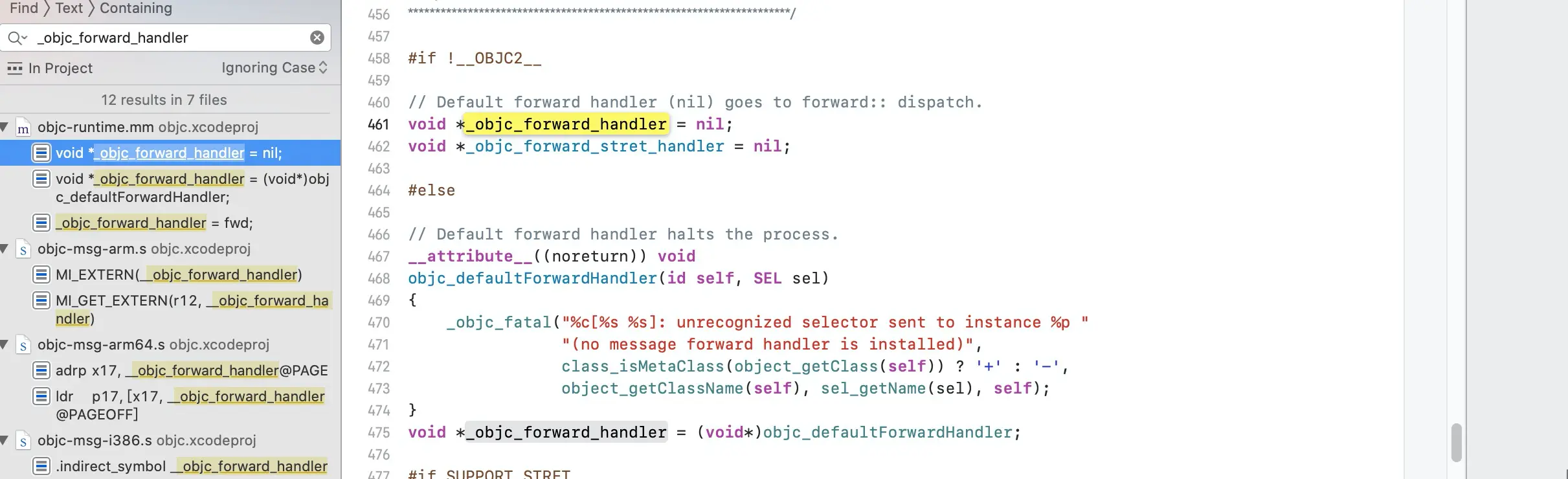 看下_objc_msgForward_impcache发现看不到,工程全局搜索_objc_msgForward_impcache,发现很多地方都引用它了,但是基本都是调用,而真正实现的地方在汇编里