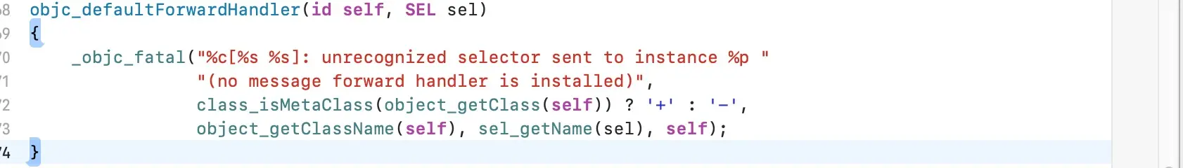 发现 void *_objc_forward_handler = (void*)objc_defaultForwardHandler;而 (void*)objc_defaultForwardHandler;的实现就在上面