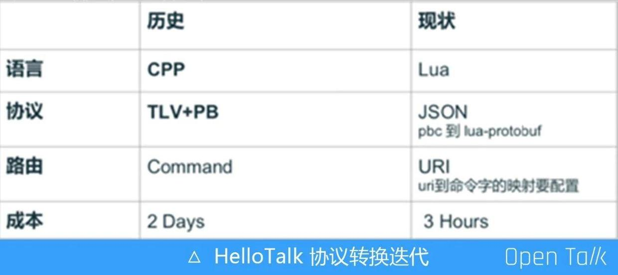 早期 HelloTalk 使用 C++ 写 IM 服务,当时是用到某大厂的高性能网络框架,协议都是内部拟定的,HTTP 协议都很少用。这对小公司而言成本很高,假设内部写服务要曝露给外部使用,还需要自己开发 Proxy Server,而最新加的命令字要做适配,这就非常麻烦了。
