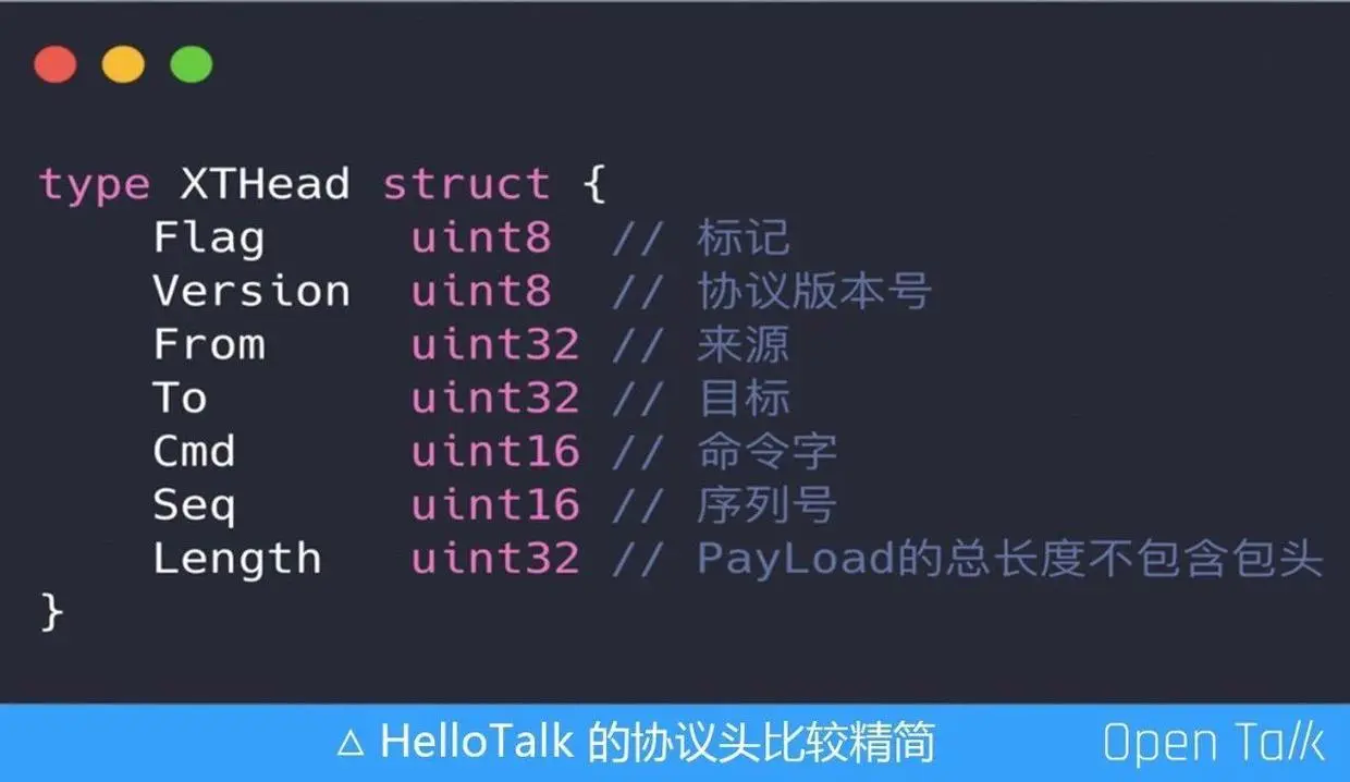 早期我们做 IM 开发都希望协议短小精悍,HelloTalk 的协议头也比较精简,全部是 TCP 的协议体。比较有意思的是通过前后加两个特殊的字节符号,定义中间的内容,即 0x09+Header(20 bytes)+Body+0x0A,基本上可以保证数据包不会出乱。如果没有前后 0x09 和 0x0A 两个包,其实还是有一定概率会产生错包的。