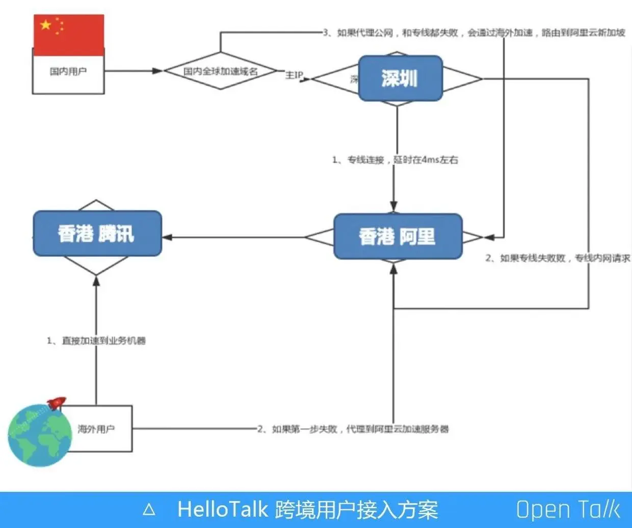 对于海外其他用户,基本全部是直接加速回到香港阿里,但直接加速会导致客户端的网络质量受地域问题影响严重,所以我们设置了一些 failover 的机制来保障用户的使用体验。