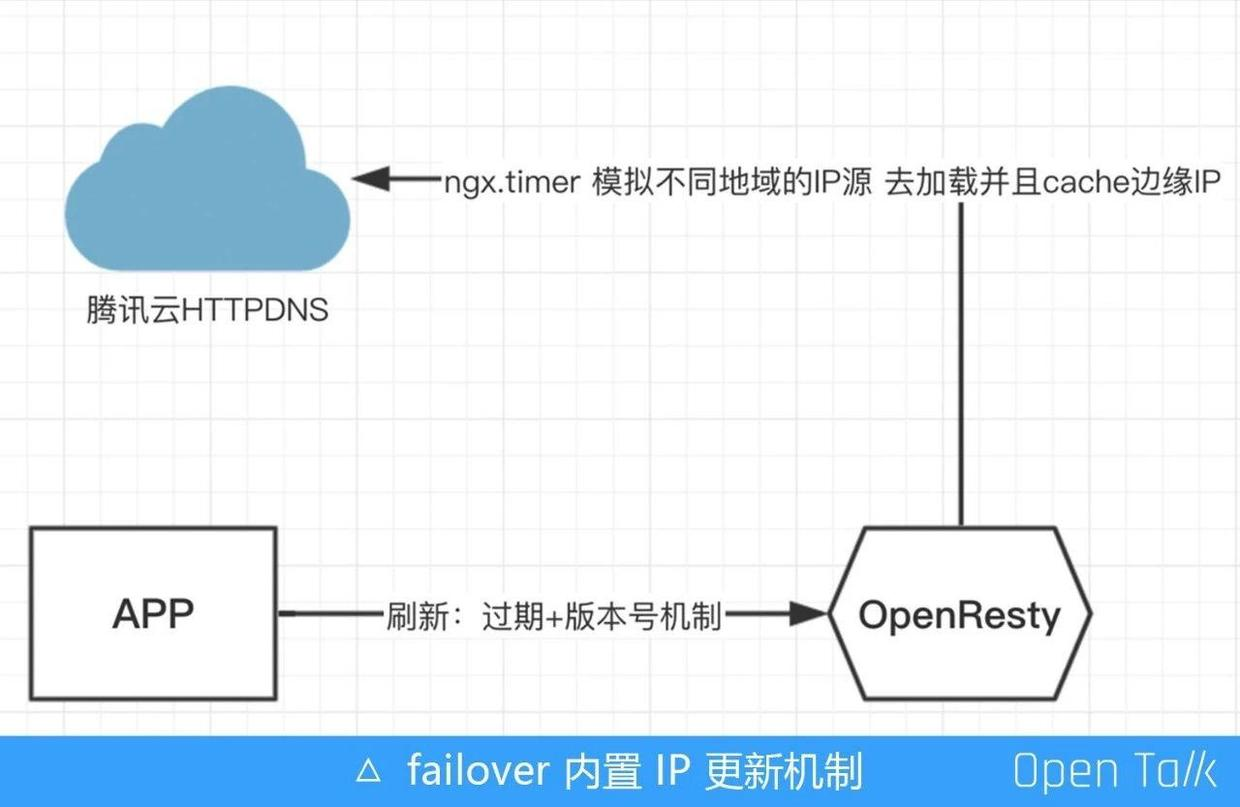 当然内置哪个 IP 到客户端也是一个问题,比如对于欧洲用户,其实肯定是要分配欧洲的 IP,那么首先我们服务端要把欧洲的服务端 IP 存起来,怎么存?什么时候存?这里我们是通过腾讯云的 httpdns + openresty timer 机制分配、缓存、更新的,上图中的 IP 就是用户的真实 IP,这个时候 httpdns 服务商就会根据 IP 参数做域名的 IP 解析。