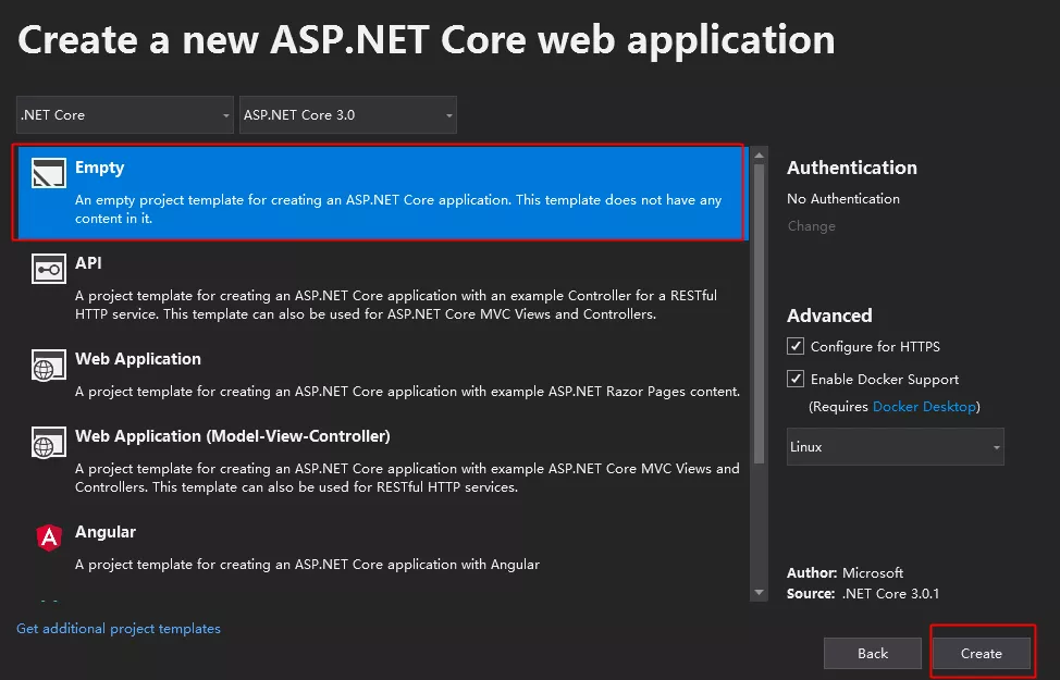 这里可以选择空模版,或者api模版,为了代码更简洁,这里选择Empty。