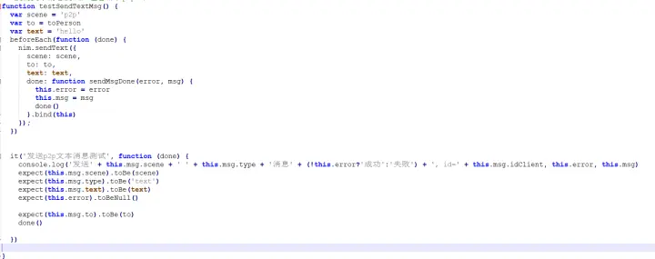 调用初始化登录的nim对象的sendText方法实现消息的发送,发送成功后sdk会调用sendMsgDone()方法返回结果,it()方法中对返回的结果断言,这里使用jasmine异步功能,当spec执行完成之后需要调用done 来告诉Jasmine异步操作已经完成,可以在全部配置文件case/const.js中配置jasmine异步的超时时间,配置项为