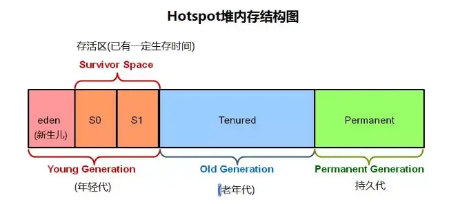 上一代的垃圾收集器(串行serial, 并行parallel, 以及CMS)都把堆内存划分为固定大小的三个部分: 年轻代(young generation), 年老代(old generation), 以及持久代(permanent generation)。