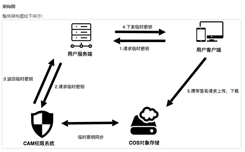 由于密钥放在前端会显示 SecretId 和 SecretKey,我们把永久密钥过程放在后端,前端通过 ajax 向后端获取一个临时密钥,正式部署时请再后端加一层您网站本身的权限检验。