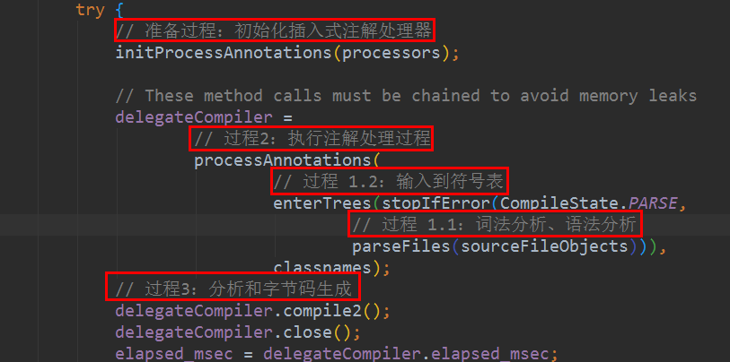 从 Sun Javac 的代码来看,编译过程大致可以分为三个步骤:
