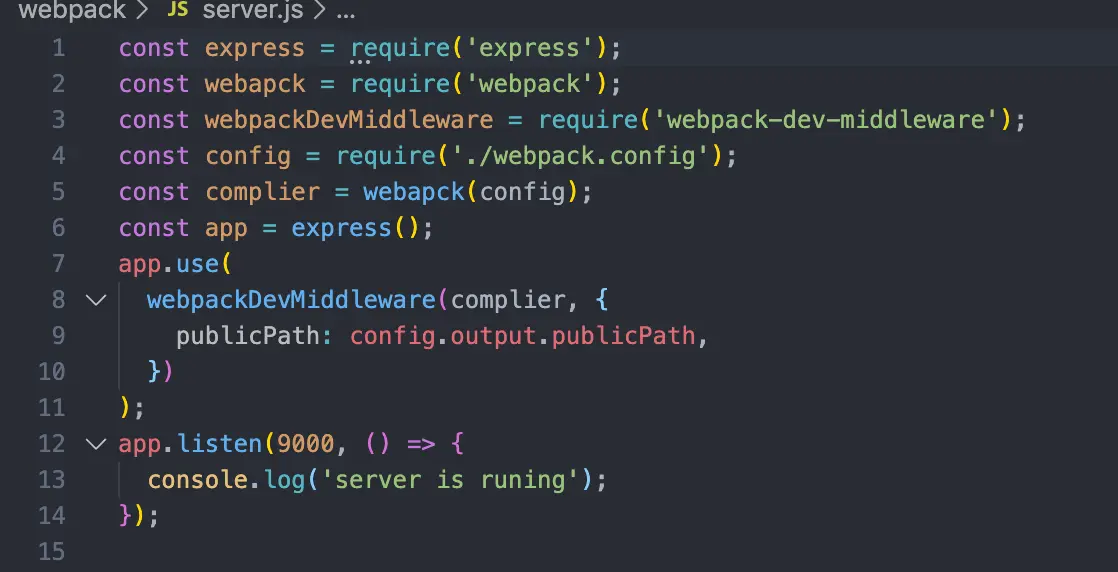 首先引入express,然后监听端口为9000,再引入webpack,webpackDevMiddleware,还有我们的webpack.config。complier是node解释webpack的解释器,具体的我也不知道是干啥的,webpack-dev-middleware的官网上有,我也是抄的。再然后就是app.use(webpackDevMiddleware),我们把complier传进去,后边接收的是一个对象,我只配置了一个publicPath,可以看出我在weboack.config的output里边也配置了一个publicPath,这样我们server.js就写好了,然后运行npm run server,同样也可以打开localhost:9000的端口,改变代码仍然会重新打包,但是浏览器需要手动刷新,是因为我们没有配置全,官方文档我还没看完,具体配置项请自行查看,谢谢!!官方地址www.npmjs.com/package/web…