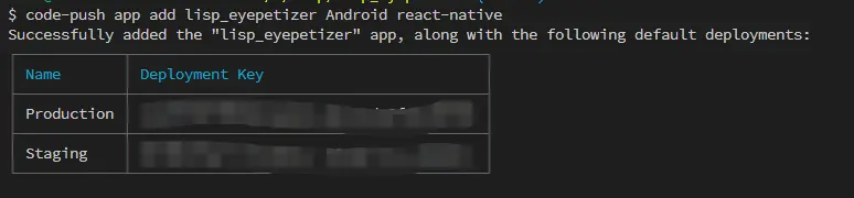 为了让CodePush服务器有我们的App,我们需要在CodePush中注册App,输入下面命令即可完成注册。这里需要注意的是注册分为IOS和Android两个平台,这里只讲解Android的,下一篇写IOS的。