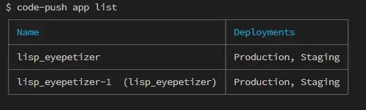 $ code-push app list