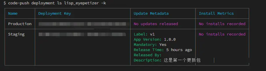 你可以通过code-push deployment ls <appName> -k来检索你的App中Production值和Staging值。