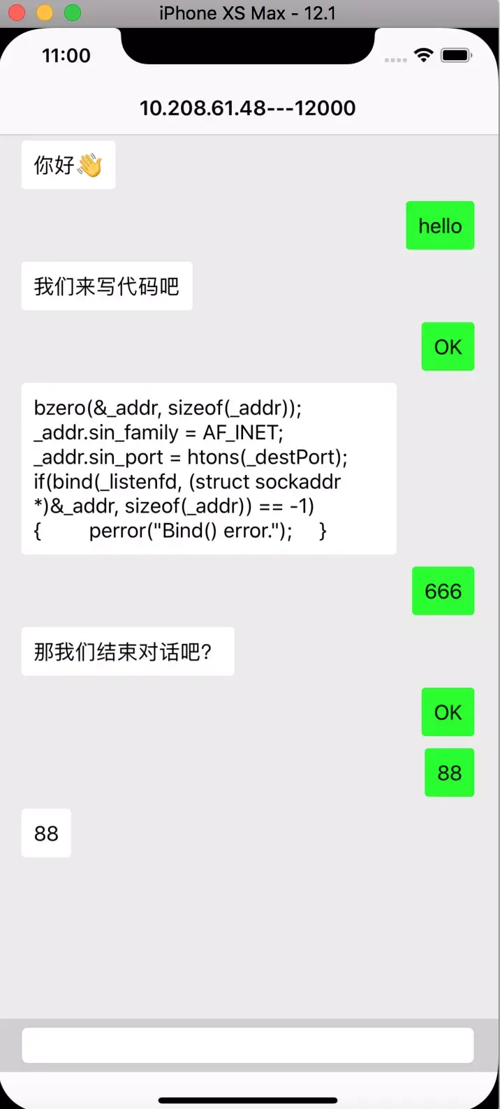 UI就不多做介绍了,控制器里只有一个显示接收和发送消息内容列表的tableView及一个编辑消息的输入框textField。大概就这些内容,只是个简易的demo,只实现了接收发送文字消息的功能,并没有做更多优化