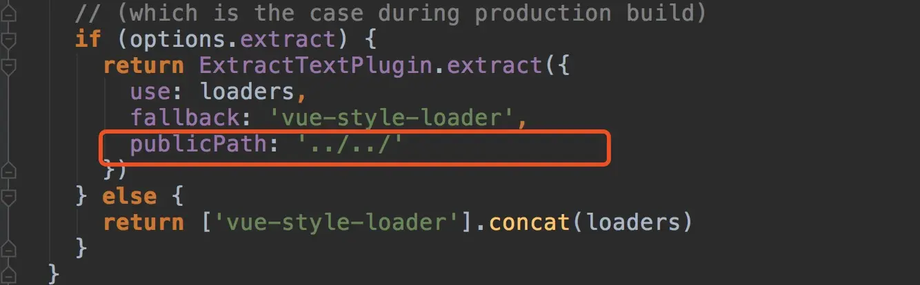 vue中背景图片打包后不显示的问题 是胆小鬼吖 2020-01-08 257 阅读1分钟 1.若在css中引用图片如下,打包之后是无法在正常显示的: 此时若想显示正常,则需修改 build文件夹下的utils.js 文件,修改如下: 注⚠️: 当项目中引用element-UI的icon不显示,也需修改此处