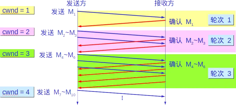如图,最初cwnd值为1MSS,发送一个报文段M1。收到M1的确认后,cwnd增加为2MSS,这时可以发送两个报文段M2,M3。收到这两个报文段的确认后,cwnd则增加为4MSS,可以发送四个报文段,以此类推...